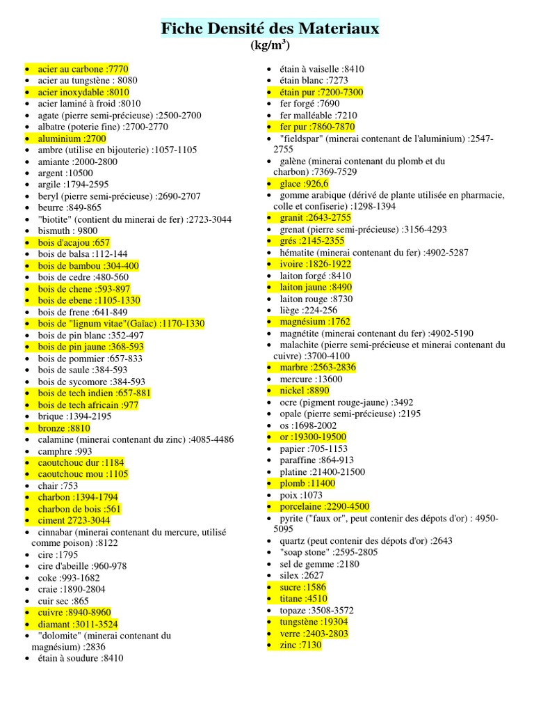 Étain 7.29 terre argileuse 1.3 à 2.00 fer 7.84 tungstène 19.30 Elles jaugent en usine la masse volumique réelle de chaque ingrédient pour vous proposer un matériau de qualité et garantir la réussite de n'importe lequel de vos travaux. Ladensité est simplement un rapport masse sur volume. Néanmoins, en tous les cas, ces derniers peuvent présenter de nombreux avantages. Les bétons lourds sont utilisés pour la stabilisation (radiers lourds, lests, contrepoids) et pour réaliser des écrans de protection contre les rayons ionisants (réacteurs de centrales nucléaires, salles de radiothérapie, accélérateurs de particules, etc).